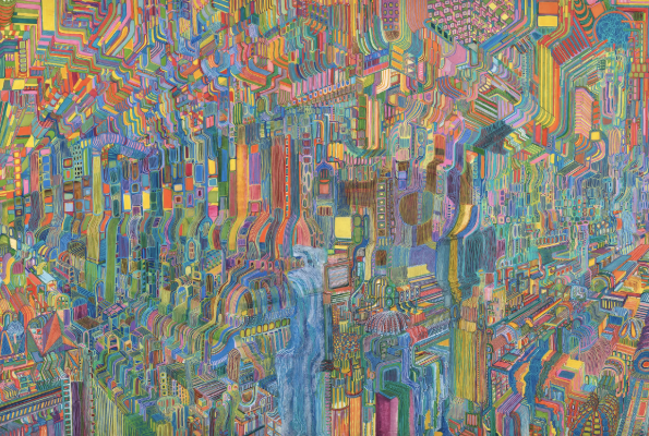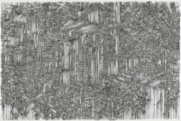 Margritt Martinet is a contemporary French artist known for her immersive, large-scale drawings that unfold like futuristic, labyrinthine cityscapes. Working primarily with pencil and ink, she creates intricately detailed worlds that are developed organically over years, reflecting an intuitive process where form and structure emerge step by step. Her work sits at the intersection of precision and imagination, transforming simple materials into complex visual narratives that evoke both the architecture of imagined futures and the inner workings of the mind.